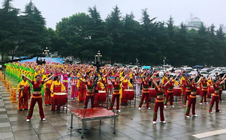 6月24日上午,阵雨过后,透着清凉,伴随着懒懒升起的太阳,常德市广播电视台前人潮涌动,热闹非凡。在热情洋溢的舞蹈和喧天的锣鼓声中,2018“健康湖南”全民运动会暨“中国联通”武陵区第七届广场舞大赛的拉开了帷幕。 齐跳“厉害了我的国” 常德市广播电视台党组书记、台长唐直秋,常德市广播电视台党组副书记、副台长周大曙出席大赛启动仪式。武陵区委常委、宣传部长余习琼宣布大赛正式启动,武陵区人民政府副区长钱盛霞致辞。